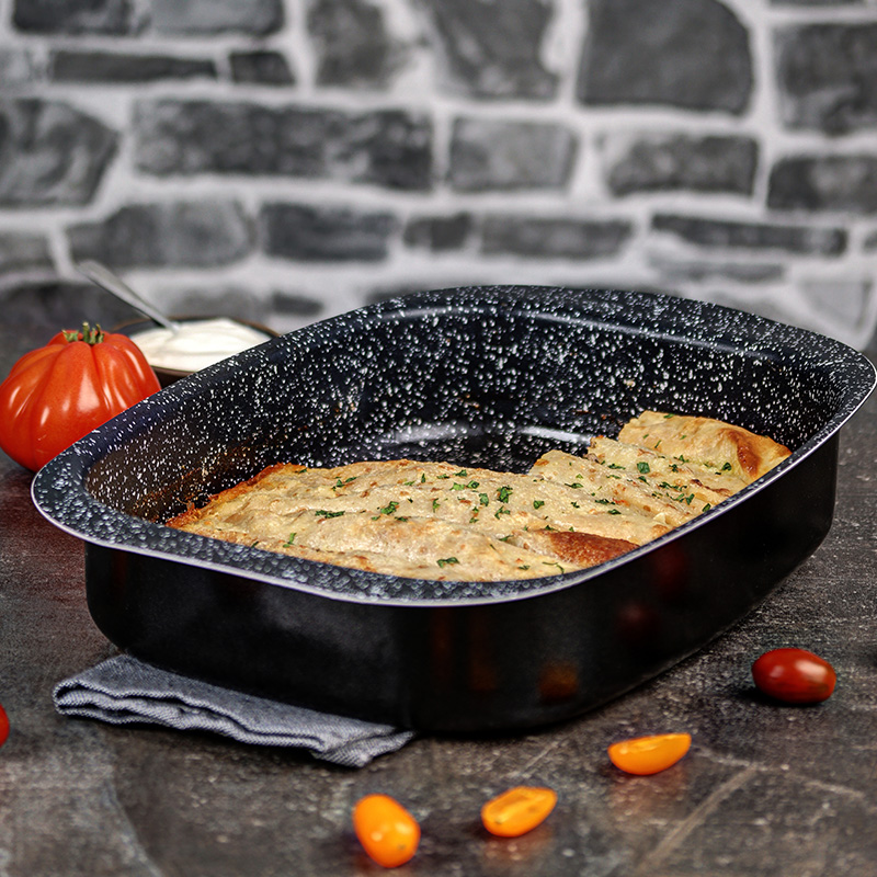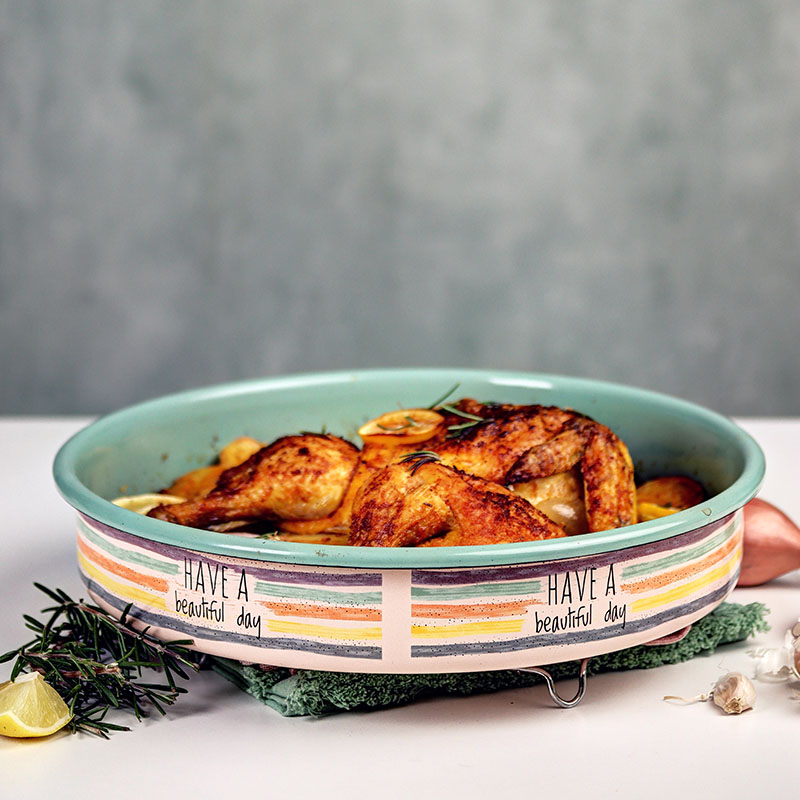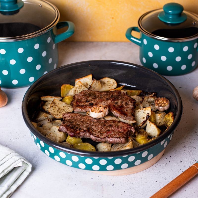 Emajlirana tepsija, pekač, đuvečara, nude dovoljno prostora za pripremu raznih jela, od pečenja do slatkih pita. Ovo posuđe je idealno za svakodnevnu upotrebu, omogućavajući pripremu obilnih i ukusnih obroka, i serviranje gotovih jela. Klasično emajlirano posuđe za pečenje je tvoj pouzdan partner u kuhinji. Sposobnost brzog i ravnomernog prostiranja toplote čini ga idealnim za različite kulinarske tehnike. TELO POSUDE je izrađeno od čeličnog lima najvišeg kvaliteta koji omogućava brzo i ravnomerno prostiranje toplote i štedi energiju. UNUTRAŠNJI I SPOLJAŠNJI EMAJL je otporan na habanje i ogrebotine. Izuzetno je gladak, neporozan i sprečava zadržavanje bakterija.